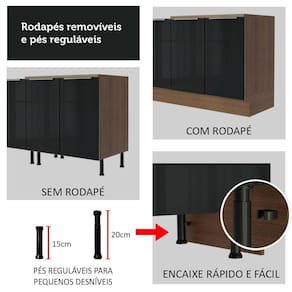 Além disso, é desenvolvido com materiais de alta qualidade, como puxadores em alumínio e corrediças e dobradiças metálicas, diferenciais que prolongam a vida útil do produto. O acabamento da estrutura interna e externa é no padrão amadeirado Rustic. A porta e as frentes das gavetas possuem pintura preta. O processo é feito em Pintura Poliéster ecológica, com 7 camadas de proteção contra os efeitos da água e do calor. Este balcão pode ser combinado com outros módulos e com todas as cozinhas da linha Lux da Madesa.