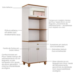 A Torre Quente 3P1G é ideal para aqueles que buscam otimizar o espaço de cozinha sem sacrificar o estilo e a sustentabilidade. Elaborada com tampos e bases em madeira maciça de 2,5cm de mata reflorestada, destacando nosso compromisso com práticas ambientais responsáveis. Os pés torneados em madeira maciça não só reforçam a estabilidade e durabilidade da peça, mas também asão compostos com regulagens que adaptam melhor o módulo ao chão. Os puxadores, com sua textura de ouro velho, enriquecem o visual da torre quente, complementando perfeitamente o design provençal. A pintura atóxica e o acabamento em laca garantem um aspecto estético refinado e uma durabilidade prolongada. Acabamento da Prateleira: Pintura UV Escala de Brilho da Prateleira: Semi-Brilho Acabamento da Gaveta: Pintura UV Escala de Brilho da Gaveta: Semi-Brilho Material do Puxador da Gaveta: Metal Acabamento da Porta: Pintura UV Escala de Brilho da Porta: Semi-Brilho Material do Puxador da Porta: Metal Acabamento dos Pés: Verniz Acompanha Rodapé Decorativo: Não Acompanha Tampo: Sim Altura dos Pés: 105 cm Altura Máxima dos Pés: 105.0000 Ambiente Principal: Cozinha Balcão Suporta Pia: Não codigo_ean: 7900288224262 Complexidade da Montagem: Média: pode ser montado por mais de uma pessoa e/ou necessite de maior conhecimento para montagem Cor: Off White Cor do Produto: Off White Cor Interna: Off White Escala de Brilho: Semi-Brilho Espessura do Tampo: 2,5 mm Gaveta com Chave: Não Itens Inclusos: 1 Torre Quente, Kit Ferragens e Manual de Montagem Linha ou Coleção: Joy Manual de Montagem e Instalação: https://product-hub-prd.madeiramadeira.com.br/419974218/documents/f0609690-29c6-4ce3-b07e-e648800d4781bc14c05131179b6b1757098412.pdf Marca: Móveis Serpil Material da Corrediça: Metálica Material da Dobradiça/Corrediça da Porta: Metálica Material da Gaveta: MDF Material da Porta: MDF Material da Prateleira: MDF Material dos Pés: Pinus modular: Sim Necessita Montagem: Sim Origem do Produto: Nacional Pés Reguláveis: Não Peso: 65 kg Peso Máximo por Gaveta: 7 kg Peso Máximo por Prateleira: 30 kg Possui Espelho: Não Possui Possui Pés: 04 Possui Portas: Sim Possui Prateleiras: Sim Possui Rodízio: Não Possui Vidro: Sim Produto Montado: Sim Recomendações de Uso, Manutenção e Limpeza: Use um pano macio levemente umedecido. Não utilizar produtos abrasivos. Sapatas Niveladoras: Sim Sistema de Montagem: Parafusos, cavilhas, minifix Suporta Até (kg): 150 kg Tipo de Corrediça da Gaveta: Metálica Telescópica Tipo de Dobradiça/Corrediça da Porta: Simples Tipo de Puxador da Gaveta: Externo Tipo de Puxador da Porta: Externo