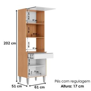 Torre Quente Andreia, desenvolvida para oferecer praticidade e elegância à sua cozinha. Produzida em MDP 12/15 mm (fundo 3 mm) com acabamento em pintura UV. Possui portas com dobradiças metálicas (sendo a superior basculante com pistão a gás), gaveta com corrediça metálica, prateleira interna e espaço para forno e/ou micro-ondas. Conta ainda com puxadores em alumínio e pés plásticos com regulagem (altura de 17 cm). Produto entregue em 02 volumes.