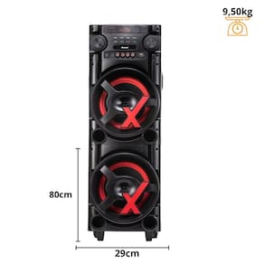 Especificações técnicas: - Sistema de Iluminação: LED DECORATIVO - Potência: 1000W - 2 Alto-Falantes de 8" polegadas - 2 Tweeter de 1" - Frequência: 50-60Hz - Equalizador: Sim - Função Bluetooth: Sim - Função TWS: Sim (Com ACA 1000 / ACA 1300 / ACA 1900) - Função Power X: Sim - Função Microfone Prioridade: Sim - Entradas: 1 Entrada para Microfone e 1 Entrada para Instrumento - Função: Passa e Volta pasta - Função Gravar: Não - Não possui Bateria - Não Possui Rádio FM - Não possui Controle Remoto - Possui Rodinhas - Alça de Transporte: Sim - Material: MDF / Polietileno - Cor: Preto - Consumo Máximo de Energia: 60W - Bivolt: Sim - Suporte para Pedestal/Tripé: Não