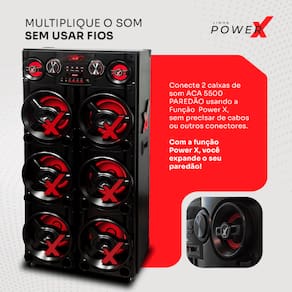 Atributos e Benefícios: - Potência de 5500W: Ideal para festas e eventos com alto desempenho sonoro e impacto garantido. - 6 Woofers de 10": Graves potentes e profundos, perfeitos para animar qualquer ambiente. - 6 Tweeters de 2" e 2 Médios de 3": Alta fidelidade nos agudos e médios, entregando som limpo e equilibrado. - Conectividade TWS: Conecte duas torres ACA 5500 sem fio para som estéreo ainda mais potente. - Conexões USB, SD e AUX: Reproduza músicas direto de pendrives, cartões de memória ou dispositivos com saída de áudio. - Bluetooth Integrado: Transmita músicas do seu celular sem precisar de fios. - Entradas para Microfone e Instrumento: Ideal para karaokê ou apresentações ao vivo. - Função Prioridade Microfone: Reduz o volume da música automaticamente ao usar o microfone. - Equalizador Completo: Controle total do som com ajustes de grave, agudo e eco do microfone. - Função Passar Pasta: Navegação prática entre arquivos de música. - Iluminação LED: Visual moderno com efeitos de luz que acompanham o ritmo da festa. - Bivolt Automático: Maior praticidade para uso em diferentes tomadas. - Design imponente: Estrutura robusta com visual “paredão” para destacar-se em qualquer evento.