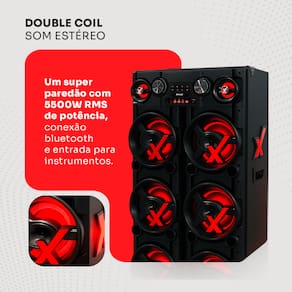 Ficha Técnica: - Marca: Amvox - Modelo: ACA 5500 Paredão New X - Potência: 5500W - Cor: Preto - Tensão: Bivolt - Conexão: Bluetooth/TWS Com outra 5500 Paredão - Qtd. de Woofers: 6 - Tamanho dos Wooffers: 10" - Qtd. Tweeter: 6 - Tamanho dos Tweeter: 2" - Qtd. Médios: 2 - Tamanho Dos Médios: 3" - Função Passar Pasta: Sim - Entrada: USB/SD/AUX - Entrada Para Microfone e Instrumento: Sim - Função Prioridade Microfone: Sim - Equalizador: Sim - Eco do Microfone: Sim - Ajuste de Grave: Sim - Ajuste de Agudo: Sim