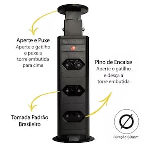 Especificações técnicas: - Furo padrão 60mm; - Corrente elétrica: até 20A; - Voltagem: até 250V (bivolt); - Potência máxima: até 3500W; - Espaço para 3 tomadas; - Padrão brasileiro de acordo com nbr 14136; - O cabo da Torre possui 1,6m.