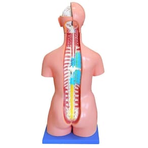 Modelo confeccionado em resina plástica, composto por cabeça removível em 3 partes, parte craniana exposta na lateral, cavidade nasal, metade do cérebro com cerebelo e bulbo, artérias, globo ocular, nervo óptico, epiglote, esôfago, cartilagem tireóide, glândula tireóide, traquéia, diafragma, músculo peitoral maior, glândula mamária, pulmão (2 partes), coração (2 partes), fígado com vesícula biliar, estômago (2 partes), intestino (grosso e delgado), metade do rim, órgãos genitais intercambiáveis, veias e filamentos nervosos com