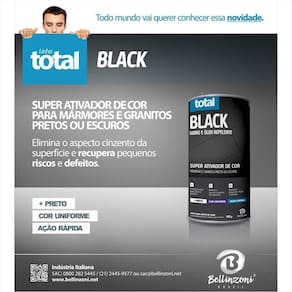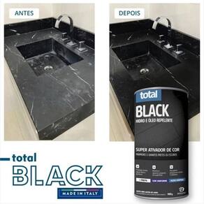 O super ativador de cor Total Black é um poderoso produto de cor preta com alta capacidade de penetração na superfície de mármores ou granitos pretos ou escuros.Aplique o Total Black na superfície totalmente limpa, seca, livre de ceras e poeiras, com auxílio de uma estopa ou pano. Espalhe bem o produto de maneira uniforme, no mesmo sentido, cobrindo toda a área a ser tratada. Superfícies de AplicaçãoMármoreGranitoRendimento1kg rende aproximadamente 40 m2.