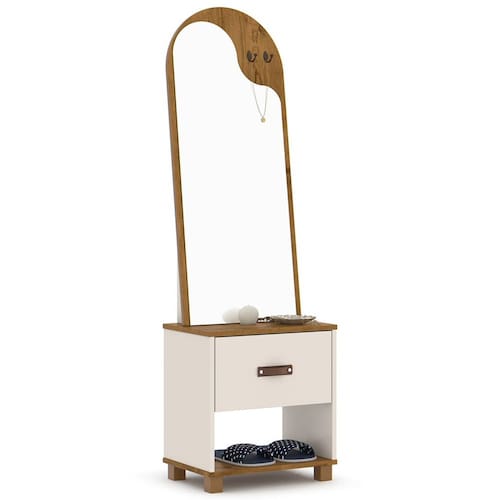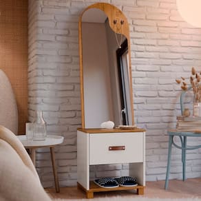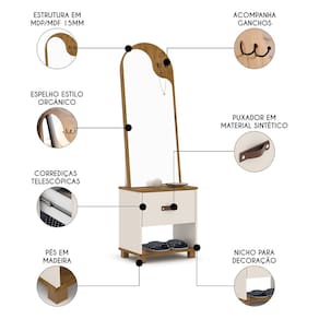 Com um design moderno e clean, o toucador Organic se adapta facilmente a qualquer ambiente, seja ele uma suíte, closet ou até mesmo um quarto pequeno. Suas linhas suaves e acabamento impecável conferem um toque de sofisticação ao ambiente, deixando-o ainda mais elegante. O destaque desse móvel estilo penteadeira é o seu amplo espelho, que proporciona uma visão completa do seu rosto e cabelo, permitindo que você faça sua maquiagem ou arrume o cabelo com precisão. Já com a gaveta, você terá espaço suficiente para guardar seus produtos de beleza, como maquiagens, cremes, perfumes e acessórios. Tudo ficará organizado e ao alcance das suas mãos, facilitando a rotina de beleza do seu dia a dia.