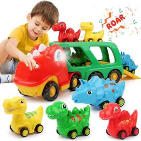 ?Diversão sem fim para crianças?Há 1 brinquedo transportador dianteiro de inércia e 4 brinquedos de transporte traseiro de dinossauro. Basta empurrar o grande caminhão transportador de brinquedos para frente, ele avançará sozinho. Abra a porta traseira para descarregar o mini-veículo. Além disso, puxe o pequeno caminhão dinossauro para trás e solte a mão, eles avançarão sozinhos. A cabine do caminhão e o trailer atrás dela podem ser separados à vontade. Brinquedos fáceis e divertidos para bebês de 18 a 24 meses.