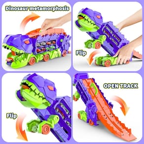 Este transportador de dinossauro da cidade permite que as crianças desenvolvam brinquedos que foram acomodados desde a infância. Eles podem incentivar jogos imaginativos, criatividade e ajudar a melhorar a capacidade de coordenação com os olhos e os olhos. Existem três maneiras diferentes de jogar carros de dinossauro: 1. Dinossauro engolir e depois usá-lo (pode engolir 4 carros) 2. Promove o deslizamento (também deformação de forma dupla) 3. Pressione as teclas para deslizar, pista de corrida dupla. Este brinquedo pode ser utilizado como presente para aniversários, Natal, Ação de Graças e outros feriados para crianças de 3, 4, 5 e 6 anos de idade. Especificações: Tamanho do modelo: 43 x 14 x 17 cm Tamanho expandido: 63 x 14 x 30 cm Material do produto: plástico ABS Características do produto: deformação de forma dupla, deslizamento de corrida, armazenamento Idade de uso: 3 anos e mais de 3 anos Embalagem: 1 vagão de dinossauro, 4 carros - ?Pista de corrida de dinossauros 3 em 1, carros de engolir e carros de armazenamento?Este brinquedo de caminhão de dinossauro engole carros e se transforma em um dinossauro legal com 2 pistas para corridas deslizantes, e o caminhão de brinquedo pode armazenar mais de 16 carros de metal. - ?Carros de metal engolir? Empurre o caminhão dinossauro para frente e ele engolirá os 4 carros de metal no caminho. Os carros podem deslizar para fora da porta traseira aberta para simular cenas de ação de fuga do carro, proporcionando emoção e diversão para as crianças. - Dinossauro com pista dupla de corrida: levante o corpo do caminhão de dinossauro (sem montagem), pressione o pé para fazê-lo ficar em pé, depois puxe a cauda para trás e, finalmente, ele se torna um caminhão de dinossauro em pé com uma pista dupla, o que permite que 2 carros de metal corram na pista para ver quem pode deslizar mais rápido, dobre a diversão da corrida. - ?Carros de armazenamento e 4 carros de metal para presente?Este conjunto de brinquedo de caminhão de dinossauro vem com 4 carros de metal e pode armazenar mais de 16 carros, 4 de cada lado, 4 na cauda e 4 na barriga, ajudando a desenvolver as habilidades de armazenamento do seu filho. Design de alça superior, fácil de transportar. - ?Presentes perfeitos para crianças?Presentes de aniversário e Natal adequados para crianças a partir de 3, 4, 5, 6, 7 e 8 anos de idade, este caminhão de rodas durável e seguro com cabeça de dinossauro e carros de corrida de liga leve estimula brincadeiras imaginativas, criatividade e ajuda a melhorar as habilidades de coordenação óculo-manual.