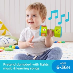 Fisher-Price Brinquedo para bebês e crianças pequenas Laugh & Learn Countin' Reps Chocalho com luzes de aprendizagem e música para crianças a partir de 6 meses - Brinquedo infantil com halteres que toca músicas, sons e luzes coloridas para diversão precoce - Botões ativam luzes, geléias legais de academia e aprendem músicas e frases sobre números, opostos e hábitos saudáveis - O peso do chocalho ativado por movimento acende quando o bebê "levanta" - Contas de chocalho, música divertida e luzes coloridas ajudam a mover os pequenos corpos - Ajuda a fortalecer as habilidades motoras finas e grossas para bebês e crianças de 6 meses a 3 anos de idade