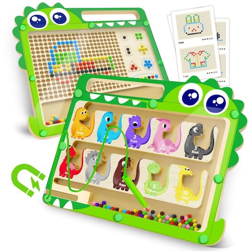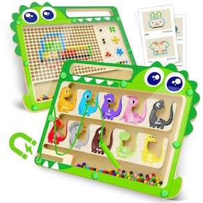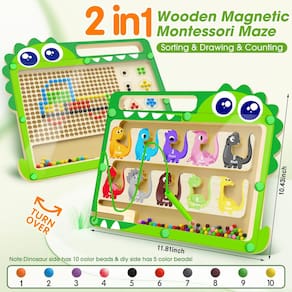 FunMission 2 em 1 Dinossauro Magnético Cor e Número Labirinto e Prancheta de Desenho, Brinquedos Educativos Montessori de Madeira, Cor | Número | Contagem, Aprendizagem, Brinquedos Sensoriais de Motor Fino, para Meninos e Meninas a partir de 3 anos de idade - Modos de jogo duplos para aprendizagem versátil: este labirinto magnético de dinossauro e prancheta de desenho apresenta dois estilos de jogo emocionantes - um labirinto de reconhecimento de cores e números de um lado e uma tela de arte de contas magnéticas do outro, para diversão educativa - Paleta de cores ricas e contas abundantes: o labirinto apresenta uma coleção de 10 contas coloridas, enquanto o lado da prancheta vem equipado com 5 cores vibrantes, 20 contas cada, estimulando a cognição visual e numérica em crianças - Criatividade DIY e diversão padronizada: Inclui 3 cartões de atividades com 12 designs diversos, inspirando as crianças a recriar padrões guiados ou embarcar em suas próprias jornadas imaginativas, estimulando a criatividade e habilidades de resolução de problemas - Design atencioso para melhorar a experiência: cada conta é trabalhada com acabamentos brilhantes e atraentes. A placa de acrílico é projetada com um compartimento para caneta, fixações seguras, bordas lisas e uma alça prática, garantindo segurança e conveniência durante a hora de brincar - Uso guiado para aprendizado ideal: vem com instruções claras enfatizando o uso da caneta magnética forte, recomendando armazenamento vertical para manter sua funcionalidade e promovendo técnicas adequadas de aderência do lápis para o desenvolvimento ergonômico das crianças