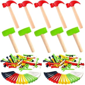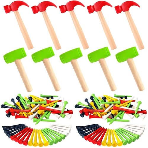 - ? Muita diversão: o conjunto colorido de brinquedos Wooden Mallet inclui 10 martelos de brinquedo e 100 peças de camisetas de golfe de madeira que adicionam um elemento brilhante e colorido à infância.