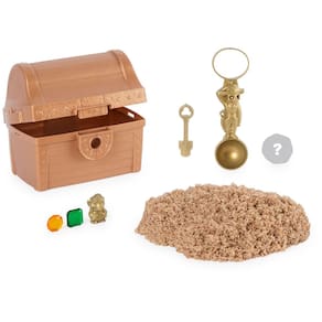 - Agora você pode partir em busca de fortuna com o Buried Treasure Game of Kinetic Sand! Use a chave escondida na parte inferior do conjunto para abrir o baú do tesouro. Está cheio de areia cinética de praia! Cave com a chave, que também serve como pá, e procure seu tesouro. Você também encontrará uma camada de ouro brilhante, ônix ou areia prateada. Você não saberá o que conquistou até chegar ao fundo do poço! Encontre a ferramenta escondida que o ajudará a coletar, transportar ou cavar sua areia cinética. Continue procurando até encontrar três moedas de bronze ou prata, ou até mesmo a rara moeda de ouro!