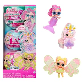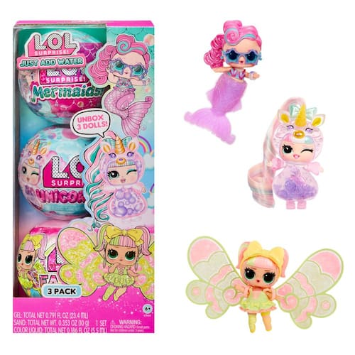 LOL Surprise Tots Just Add Water Pacote com 3 bonecas de fantasia e mais de 25 surpresas para unbox, incluindo bonecas sereia, fada e unicórnio e artesanato mágico – Ótimo presente para crianças a - Descubra o que está dentro?! Desembale o L.O.L. completo Coleção de fantasia surpresa com este pacote de 3 Just Add Water! Descubra um novo padrão de jogo que permite criar e personalizar seu bebê para dar à sua boneca um visual único e bonito. - Pacote com 3 Fantasias: Inclui 3 bonecas Fantasy Tots! Encontre seus adoráveis personagens de sereia, fada e unicórnio com artesanato mágico e modas combinando dentro! Unbox 1 LOL Surprise Mermaids Tot, 1 LOL Surprise Fairies Tot e 1 LOL Surprise Unicórnios! - Desembale mais de 25 surpresas! Qual personagem de fantasia você descobrirá primeiro? Desembale todas as surpresas fofas para encontrar seus 3 pequenos e seus acessórios mágicos! Inclui 3 crianças de fantasia, um par de asas de fada, 2 cores de mistura de cristal de fada, pipeta de coração, cauda de sereia, gel colorido, 2 poções coloridas, chifre de unicórnio, orelhas de unicórnio, penteado, funil, chifre decorativo de unicórnio LOL bola, adoráveis modas de fantasia e tapetes. - Crie uma cauda de sereia que muda de cor: faça um mergulho com seu bebê de sereia criando suas próprias caudas de sereia que mudam de cor para sua boneca! Basta misturar as 2 cores de gel, despejar a mistura no molde da cauda e deixar descansar por 30 minutos para se transformar magicamente em uma cauda de sereia colorida. Quando sua filha estiver vestida com sua nova cauda deslumbrante, mergulhe-a em água fria para revelar uma linda mudança de cor! - Personalize asas de fada de cristal: voe para os céus com seu bebê de fadas personalizando suas próprias asas de cristal de fada! Basta colocar as asas no tapete incluído e espalhar duas cores de mistura de cristal de fada nas seções abertas das asas para criar o padrão desejado. Use a adorável pipeta de coração para jogar água sobre o pó de fada para definir seu belo design e deixe os cristais secarem por dois minutos antes de passar para o outro lado. Quando ambas as asas estiverem totalmente definidas, sua fada estará pronta para você prender suas novas asas brilhantes! - Faça um unicórnio bolhinho: personalize seu interior colorido e borbulhante! Basta colocar a metade inferior da bola na abertura do tapete de jogo incluído de lado para baixo e fixar o seu bebê ao suporte de exibição embutido. Localize a abertura na parte superior do rosto fofo da sua boneca e use o funil e os adoráveis conta-gotas de coração para espremer cuidadosamente as "poções" coloridas dentro do seu bebê. Sele a abertura com o chifre de unicórnio do seu bebê e vire-o para ver as bolhas coloridas deslizarem umas pelas outras! Para um efeito mágico adicional, ilumine uma luz de telefone através do seu bebê para iluminar o interior colorido dela! - Colecione todos: descubra o que está dentro e colecione o L.O.L. Bonecos de fantasia personalizáveis Surprise Tots com este pacote de 3 Just Add Water!