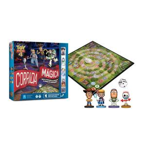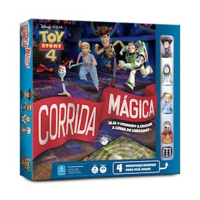 Toy Story 4 – Corrida Mágica Preparar, apontar e fogo! Seja o primeiro a cruzar a linha de chegada, nessa alucinante aventura com Buzz, Woody, Beth e o novo brinquedo da turma o Garfinho! Jogue o dado e comece a Corrida Mágica. Cuidado onde você vai parar no caminho! Algumas casas te fazem avançar e outras te fazem perder o turno. Quem vai ganhar e ser o vencedor dessa corrida mágica?