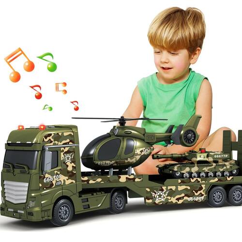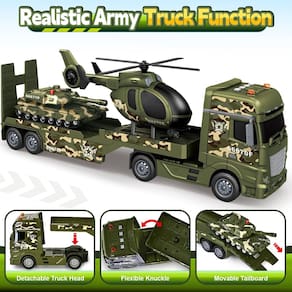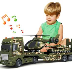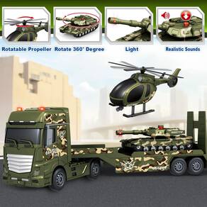 Conjunto de brinquedo multifuncional grande caminhão do exército para crianças de 3 a 8 anos. As crianças podem montar uma cena de resgate à vontade e experimentar a sensação imersiva. Acionada pelo botão, a lança do guindaste levanta e gira, permitindo que as crianças levantem habilmente o carro de corrida na mesa plana e o girem 60 graus para a esquerda ou direita. A mesa plana no caminhão levanta e desliza, imitando um trailer real. - Brinquedo de caminhão infantil 3 em 1: este caminhão de grande valor inclui um caminhão, helicóptero e tanque de 63,5 cm. O tanque tem luzes e sons, e a hélice pode ser girada manualmente. O tanque pode funcionar rápido. Várias maneiras de brincar, use a imaginação do seu filho para criar mais cenários de brincadeira. Este conjunto de brinquedo de caminhão do exército pode exercitar bem a coordenação olho-mão e a imaginação das crianças. - Caminhão motorizado grande multifuncional: este caminhão de brinquedo infantil para meninos vem com um caminhão de brinquedo de 63,5 cm acionado por fricção. Tudo o que as crianças precisam para construir uma cena de resgate está nele. A cabeça do caminhão pode ser separada, vire à esquerda e à direita, e o quadro traseiro pode ser movido para cima e para baixo para simular a cena de transporte de um semi-reboque real. As crianças ficarão muito felizes em receber este presente de caminhão de brinquedo. - Simulação de som e luz: este brinquedo exclusivo de caminhão de menino vem com três efeitos de som e luz (pilhas incluídas). Possui botões que as crianças podem usar facilmente. Meninos de 3 a 5 anos podem pressionar o botão acima do caminhão para reproduzir sons e acender as luzes para ouvir o som simulado do carro de corrida. Desempenhou o papel de militar com efeitos sonoros e de luz, este é um brinquedo de caminhão grande ideal para crianças, trará muita alegria e surpresas e é o brinquedo de caminhão perfeito para meninos e meninas de 3, 4, 5, 6, 7, 8 anos. - Brinquedo de caminhão premium de 63,5 cm: este brinquedo de caminhão grande de 63,5 cm é feito de plástico de alta qualidade, não tóxico e sem sutiã. Este caminhão de reboque de brinquedo para crianças tem bordas arredondadas para brincadeiras seguras. o tamanho é adequado para agarrar e crescer com meninos e meninas. Além disso, este caminhão infantil tem uma função push-and-go, que as crianças empurram e dirigem facilmente, o que pode exercitar bem as habilidades motoras das crianças. - Presente ideal para crianças a partir de 3 anos: o conjunto de brinquedos de caminhão militar infantil vem com uma linda caixa de presente, que é um ótimo presente para aniversários infantis, Dia de Ação de Graças, Dia das Crianças, Natal, Dia das Bruxas, Ação de Graças e Ano Novo, e um ótimo presente de caminhão de brinquedo para meninos de 3, 4, 5, 6, 7, 8 anos. Este brinquedo de caminhão grande para crianças é um brinquedo ideal para melhorar a coordenação motora e a imaginação das crianças, estimular a criatividade e promover o desenvolvimento das crianças.