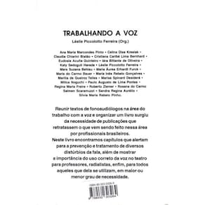 Este livro nos traz diversas abordagens no trabalho com a voz. Ensina a tirarmos o maior proveito da expressão pela voz, sem cansaços ou afonias, além de mostrar trabalhos relativos ao uso da voz no teatro, para professores e todos os que precisam da voz como instrumento de trabalho. Possui também capítulos de prevenção e tratamento dos diversos distúrbios da voz.