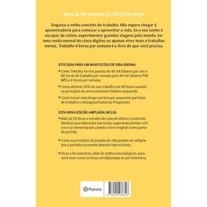 Esqueça o velho conceito de trabalho. Não espere chegar à aposentadoria para começar a aproveitar a vida. Se o seu sonho é escapar da rotina, experimentar grandes viagens pelo mundo, ter uma renda mensal de cinco dígitos ou apenas viver mais e trabalhar menos, Trabalhe 4 horas por semana é o livro de que você precisa. ESTE GUIA PARA UM NOVO ESTILO DE VIDA ENSINA: Como Timothy Ferriss passou de 40 mil dólares por ano e 80 horas de trabalho por semana para 40 mil dólares POR MÊS e 4 horas por semana. Como eliminar 50% de seu trabalho em 48 horas usando os princípios de um economista italiano esquecido. Como trocar uma longa carreira por pequenos períodos de trabalho e miniaposentadorias frequentes. ESTA NOVA EDIÇÃO AMPLIADA INCLUI: Mais de 50 dicas e estudos de caso de leitores (incluindo famílias) que dobraram sua renda, superaram pontos críticos e se reinventaram usando o livro autêntico como ponto de partida. Como os princípios do projeto de vida podem ser adaptados a períodos economicamente imprevisíveis. Dicas e ferramentas, além de atalhos tecnológicos, para você viver como se fosse um diplomata ou um milionário.