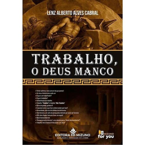 A angústia de um trabalhador ao entardecer de domingo, véspera da fatídica segunda-feira, aquela mesma sensação crescente de aperto no peito, aflição, pânico, desespero, piorando com o anoitecer, culminando num terrível pesadelo, solavancos, intensos suores, sobressaltos, pensamentos de ruína, solidão, angústia, porém dessa vez coroado com a presença dessa criatura horrenda, deficiente de uma perna, afirmando ser deus Hefesto, o “deus do trabalho em pessoa”. O livro se desenvolve nessa arena, frente a frente o trabalho e o trabalhador, ambos em crise existencial, o trabalhador, esse tal “espelho de deus”, em profunda angústia diante da sua vida inútil, só trabalhar, sem qualquer perspectiva de melhora e, Hefesto, um discriminado e amargurado deus do trabalho por não ter a sua divindade devidamente reconhecida, proclamando-se como o mais importante entre todos os deuses, o verdadeiro salvador da humanidade atual e das futuras gerações, o único capaz de vencer esse inimigo implacável, a crise socioambiental, resultado da degeneração do comportamento humano. O embate acontece em um mosaico de emoções, algum grau de identidade, intimidade, empatia, ensinamentos, cumplicidade, mas também xingamentos, agressões, trocas de insultos, insinuações, acusações, momentos engraçados, reflexivos sobre a vida humana diante da complexidade do mundo do trabalho, seus impactos no dia a dia e na sustentabilidade da vida humana nesse planeta. O clima acirra progressivamente culminando com uma explosão de fúria, em um final tragicômico, assim como a própria vida humana... Tópicos Abordados Portal satânico: mais comum do que parece! Um deus Hefesto para cada um O que é um trabalhador? O que é trabalhar? In/Satisfação no trabalho Trabalho “Trabalho” e trabalho “Não Trabalho” Bicho de goiaba, goiaba é? É possível amar o que faz e ainda receber por isso? Humanidade, mais de oito bilhões de deficientes Vida Humana, um salto de paraquedas dobrado por outro ser humano ESG, Amor Ágape, Carta da Terra: só utopia? Bócio Socioambiental “Comportamento Altereco”, uma solução para o “Bócio Socioambiental”? Trabalho, feio e manco! Ainda assim, um deus?