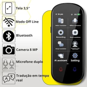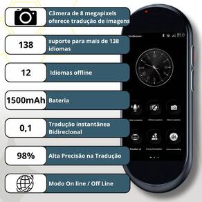 Idiomas suportados: 138 (com 12 em offline) Velocidade de tradução: 0,1?s Tela: Touchscreen IPS de 3,5? Câmera: 8?MP para tradução visual Microfone: Duplo com cancelamento de ruído Bateria: 1500?mAh – até 8?h de uso contínuo e até 168?h standby Conectividade: Wi-Fi, Bluetooth, hotspot