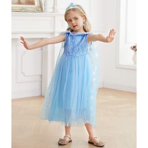O pacote inclui: 1 vestido+capa de princesa, 1 coroa de princesa, 1 varinha de floco de neve, 1 par de brincos, 1 anel e 1 peruca. Acessórios ricos transformam sua garotinha em uma linda princesa, como seu papel favorito.
