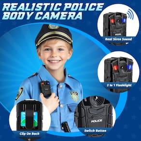 -?Conjunto realista de fantasias policiais?Design de uniforme policial Luucio com cores contrastantes elegantes e vem com uma câmera corporal policial realista que tem som de sirene real e lanterna que atrairão profundamente seu filho! Isso proporcionará às crianças uma experiência policial mais realista e fará com que se sintam como policiais reais, que serão as mais legais no concurso infantil de festas à fantasia de Halloween quando se vestirem como policiais para o Halloween.