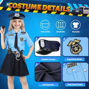Todo o traje policial pode ser lavado, então você não precisa se preocupar com o fato de seu filho fazer bagunça quando você sair para brincar!