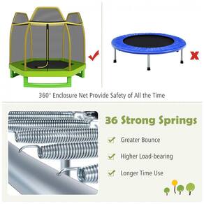 Descrição Este trampolim redondo de segurança ajudará os seus filhos a melhorar as suas capacidades de salto, ao mesmo tempo que promove o seu metabolismo corporal e melhora a sua imunidade. É caracterizado por uma forte estrutura de aço galvanizado e base triangular para aumentar a estabilidade, e a cerca de segurança está firmemente conectada à plataforma de salto para eliminar lacunas perigosas e proteger os pés do bebê contra lesões. A capa protetora de espuma EPE evita que seu filho colida acidentalmente ao pular livremente. Nosso trampolim é o presente perfeito para as crianças. Características Há uma rede protetora externa para proteger seu filho ao pular Rede protetora externa com zíper em forma de L, centro de atividades em grande escala Força de mola forte, grande força de tração, sem deformação A rede de segurança fortalece o amortecedor e tem forte resistência ao impacto Almofada de plataforma PP, desgaste capa protetora de espuma EPE resistente e de boa resiliência para evitar choques acidentais Pano Oxford acolchoado não belisca os pés do bebê Promove aumento de altura, melhora o efeito físico Especificações Material Aço galvanizado, PP, EPE Dimensão total 7,3 pés x 7,3 pés x 6,1 pés C x L x A Peso líquido 55 libras Capacidade de peso 220 libras O pacote inclui 1 x trampolim 1 x manual do usuário Rede de gabinete respirável Zíper em forma de L O trampolim infantil está equipado com uma rede de gabinete respirável. Ele não apenas mantém seu filho , mas também ajuda você a ficar de olho nos movimentos do seu filho. O zíper em forma de L tem um fecho aderente que é mais do que o zíper comum e pode garantir um melhor fechamento quando eles brincam. Trampolim de segurança para crianças O design perfeito entre a cerca e a almofada, para que seu filho não fique preso no vão. O protetor de espuma EPE evita que seu filho bata acidentalmente ao pular livremente. E o grande tapete de plataforma circular de 83 polegadas de diâmetro oferece espaço suficiente para as crianças. Estrutura galvanizada resistente Este trampolim infantil de 7 pés é composto por uma estrutura de aço galvanizado e uma base triangular reforçada. Ele pode suportar um peso de 220 libras e evitar efetivamente que escorregue ao pular da plataforma. Longa vida útil Anexado com mola espessa anti ferrugem, alta elasticidade, sem deformação, para garantir o uso a longo prazo. A almofada da plataforma de salto é confeccionada em material PP, com elasticidade de alta qualidade, permitindo que as crianças pulem mais alto e mais felizes. Presente perfeito para crianças. Dimensão geral 7,3 pés x 7,3 pés x 6,1 pés C x L x A. Este trampolim recreativo será um destaque atraente para o seu quintal e servirá como um centro de atividades ao ar livre para o seu tempo semanal de diversão em família, garantindo que seus filhos e amigos caiam na gargalhada todos os dias. O presente perfeito para crianças