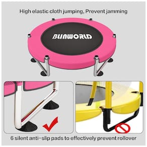 O trampolim possui esteira de sucção silenciosa, tubo de espuma anticolisão e é estabilizado com três séries de Ufeet equipados com duas ventosas silenciosas aprimoradas, que podem silenciar efetivamente o trampolim e fornecer tração para o trampolim, evitando quedas.