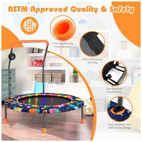 Este mini trampolim é atualizado com luzes LED coloridas piscantes e um alto falante Bluetooth recarregável, proporcionando às crianças uma experiência de salto divertida enquanto ouvem suas músicas favoritas. A capa protetora acolchoada macia possui padrões fofos, enquanto o corrimão revestido com espuma de 5 mm mantém as crianças equilibradas durante os saltos. A estrutura de aço à prova de ferrugem tem 5 tubos de perna estáveis com almofadas de pé antiderrapantes e silenciosas. As faixas elásticas e o tapete de salto em PP resistente estão firmemente conectados, oferecendo uma experiência de salto durável e de alta qualidade. Este trampolim infantil Goplus é certificado pela ASTM para qualidade e segurança confiáveis. É um ótimo presente para crianças de 3 a 6 anos, pois ajuda a melhorar o desenvolvimento do esqueleto, a força física e a capacidade de equilíbrio. A instalação é fácil e sem parafusos, graças ao sistema de travamento automático e às instruções incluídas. Observe que as luzes requerem 2 pilhas AA não incluídas e o cabo de carregamento Bluetooth está incluído.