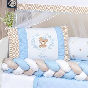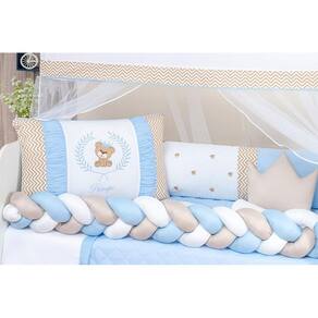 Trança protetor lateral berço avulsa menino Azul/Bege/Branco Grande Cheia Atenção: esse link só acompanha a TRANÇA. Medidas reais, super trança 145 cm x 25 cm Composição: Tecido liso: 50% algodão| 50% poliéster Enchimento: enchimento 100% poliéster Marca: L2m