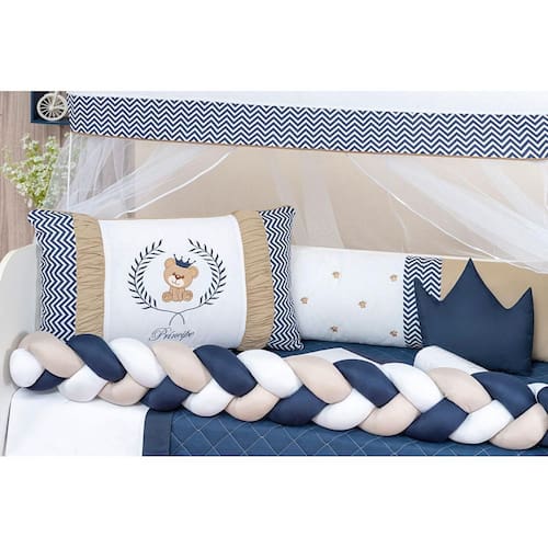 Trança protetor lateral berço avulsa menino Azul Marinho/Bege e Branco Cheia Grande Atenção: esse link só acompanha a TRANÇA. Medidas reais, super trança: 145 cm x 25 cm Composição: Tecido liso: 50% algodão| 50% poliéster Enchimento: enchimento 100% poliéster Marca: L2m Ean: 7890201038840