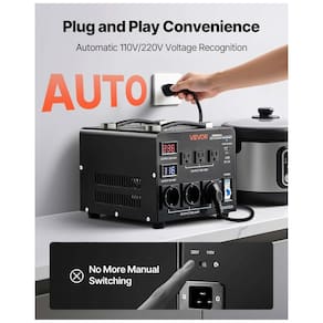 O transformador VEVOR HYMG-5000VA detecta automaticamente voltagem de entrada (110V ou 220V) através de sensores inteligentes, fornecendo saída correspondente sem necessidade de seletor manual. Inclui cabo US padrão; em redes 220-240V requer adaptador de plugue ou cabo local compatível. Capacidade máxima 4000VA com carga 80%, suportando operação simultânea de múltiplos aparelhos.