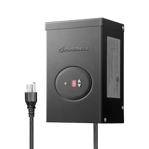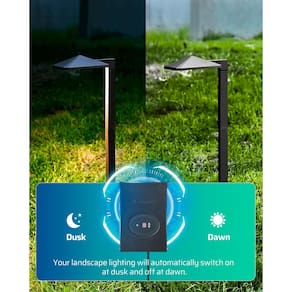 Como escolher o seu transformador 1. Calcule a potência total de suas luminárias em seu plano 2. Escolha o transformador que é grande o suficiente para suportar a potência total que você precisa. 3. A carga de potência do transformador (watts totais necessários para suas luminárias) deve estar dentro de 80% da capacidade nominal do transformador. Por exemplo: se você tiver 7 pacotes de luzes de paisagem de 13 W, a potência total é de 91W. Então você pode escolher o transformador maior que 113W (= 91W/0,8). Etapas de instalação 1. Conenct o transformador com várias luzes de paisagem. 2. Conecte-o à sua caixa de controle para ligar. 3. Se for "O", a luz funcionará o tempo todo; quando você definir para "A"(Auto) ou "1-9" (temporizador de contagem regressiva), ela não acenderá durante o dia. Mas você pode cobrir o sensor para testá-lo. Quando você cobri-lo por mais de 30 S, o sensor detectará que é noite e a luz acenderá. Especificações Entrada: 120VAC, 60Hz Saída: 12VAC Classificação de potência máxima: 120W Lista de embalagem: 1 x Transformador 1 x Manual de Uso 2 x Parafuso 2 x Pontas de Âncora de Parede: 1. O ponto (no canto inferior direito do número na tela) acenderá quando funcionar. 2. O transformador tem duas saídas com uma potência total de 120W. Você pode escolher qualquer um deles para conectar ao seu cabo. NOTA: (1) Se o transformador não se conectar com carga, não mostra saída nos terminais. Verifique se as luzes estão ligadas ou não antes de medir a tensão. (2) Qualquer cabo com mais de 45 metros por torneira não é recomendado para conectar com o transformador DEWENWILS de baixa tensão. - [Sensor de anoitecer ao amanhecer embutido] A iluminação de paisagem conectada a este transformador liga automaticamente ao anoitecer e desliga ao amanhecer. Convertendo a tensão doméstica de 120 V CA para 12 V CA de tensão de segurança usando 120 W, um nível de corrente elétrica mais seguro e útil é produzido. - [Temporizador de contagem regressiva] O tempo de controle de luz tem contagem regressiva de 1 a 9 horas. Com esta opção, o transformador ligará ao anoitecer e desligará automaticamente 1/2/3/4/5/6/7/8/9 horas depois. - [Fácil de operar e instalar] Para selecionar o modo de tempo sempre ligado, automático ou contagem regressiva, pressione a seta para cima/para baixo. Possui furos de montagem embutidos, cabo de alimentação STJW 18AWG de 1 m e montagem direta na parede para paredes externas. - [Função de memória] Você não precisa alterar o transformador de baixa tensão com muita frequência porque ele permanecerá na configuração que você escolheu antes, mesmo quando houver uma perda de energia. (Para o recurso de memória funcionar, o transformador precisa estar neste modo por pelo menos 24 horas). - [Durável e à prova d'água] Material de metal de alto desempenho, resistente à corrosão, resiste a anos de uso, protege o transformador de quaisquer condições climáticas extremas. A iluminação de paisagem não deve usar mais de 80% da capacidade total do pacote de energia.