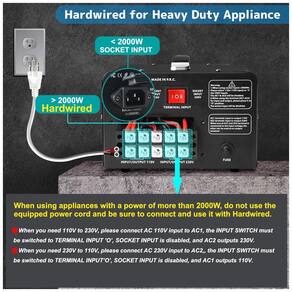 Multifunção O Transformador Conversor de Tensão pode ser utilizado com qualquer tipo de aparelho ou dispositivo de até 3400 watts. Recomendamos fator de eficiência 3X para itens de produção de calor de alta potência, como ar condicionado, cafeteira, equipamentos de soldagem, etc. Transformador de tensão 220V a 110V, 110V a 220V 110 volts até 220 volts ou de 220 volts até 110 volts. Saídas CA 3 tomadas padrão dos EUA para aparelhos de 110 120V 3 tomadas universais aceitam todos os tipos de plugues, exceto o plugue sul africano grande para aparelhos de 220 240V. EUR, Reino Unido, JP e muito mais. Proteção Disjuntor protetor para cada voltagem que é operação segura.