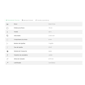 Informações Técnicas Material Pesado Painel Tecla Motor Direct Drive Potência do Motor 750 W Tensão 220 V Velocidade 2.000 rpm Tipo de Ponto Fixo Comprimento do Ponto 8 mm Número de Agulhas 1 Agulha Tipo de Agulha DPx17 Sistema de Transporte duplo Tamanho da Lançadeira Jumbo Altura do Calcador 6/13 mm Cárter Aberto Tanque de Óleo Lubrificação Automática Reta Eletrônica Transporte Duplo