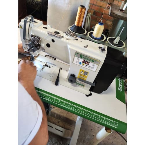 Máquina Reta 2 Agulhas com ponto fixo, lubrificação automática e transporte triplo por Dente calcador e agulha (evita o franzimento do tecido), indicada para materiais pesados como estofados, couros, lonas, sintéticos entre outros.