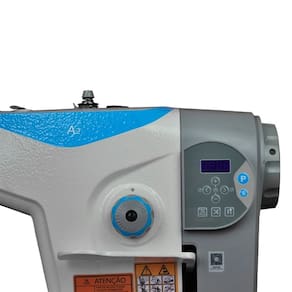 Função de posicionamento de agulha eliminando o manuseio do volante pelo operador e painel com display digital acoplado ao cabeçote da máquina.