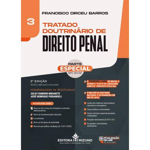 Além de haver feito um trabalho sério, acompanhando o que há de melhor na doutrina nacional e alienígena e na jurisprudência, Dirceu procurou, por outro lado, com maestria, emprestar um cunho eminentemente prático e didático à obra . Para aqueles que, como eu, conhecem-no de perto, esse seu Direito Penal representa o despontar de novo grande jurista . Fernando da Costa Tourinho Filho O trabalho de comparação doutrinária é inigualável. Somente a enorme capacidade sistêmica do autor poderia fazer com que trouxesse, em um único livro, basicamente todas as posições doutrinárias sobre o tema . Rogério Greco Aprofundando o pensamento com Zaffaroni, podemos assentar o pensamento de que uma teoria do delito deve ser considerada completa somente quando abrange o estudo da Parte Especial. Daí o valor que atribuímos à obra de Francisco Dirceu Barros . José Henrique Pierangeli A presente obra é o fruto de 20 anos de intensas pesquisas e de um árduo trabalho cujo escopo foi contextualizar em um livro, as melhores posições doutrinárias e jurisprudenciais e fazer com que o leitor, ao ler este livro, possa ter contato direto com mais de 100 livros referentes à Parte Especial (Arts. 184 a 361) do Direito Penal, destarte, conheça o pensamento dos melhores doutrinadores nacionais e estrangeiros. Francisco Dirceu Barros Marca: EDITORA MIZUNO