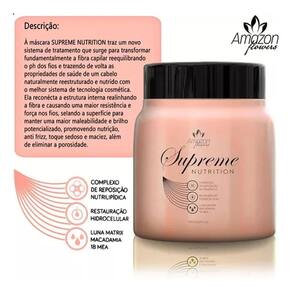 A Máscara Supreme Nutrition é um sistema de tratamento que transforma a fibra capilar, reequilibrando o pH dos fios e restaurando as propriedades de saúde de um cabelo naturalmente reestruturado e nutrido com a melhor tecnologia cosmética. Este produto reconecta a estrutura interna, realinhando a fibra e proporcionando maior resistência e força nos fios. Sela a superfície para manter uma maior maleabilidade e brilho potencializado, promovendo nutrição, anti frizz e um toque sedoso e maciez, além de eliminar a porosidade. Ativos do produto: Luna Matrix, Macadâmia e IBMEA. Ph: 3.5a 4.5 Instruções de uso: Lave os cabelos com um shampoo, recomendamos o shampoo nutritivo Stop Quebra Therapy ou o shampoo Intensificare, pois são específicos para a higienização de cabelos sensibilizados. Após lavar os cabelos, retire o excesso de água e aplique o produto, mecha a mecha, massageando e enluvando. Deixe agir por 20 minutos, depois enxágue e finalize como desejar. Dica: para uma finalização térmica, acentuando ainda mais a nutrição, utilize o Perfect Repair ou qualquer um dos nossos finalizadores. de fábrica: 36 dias Anvisa: 25351966953202035 Marca: Não Informado