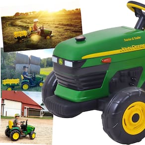 O John Deere Tractor & Trailer é recomendado para crianças a partir de 2 anos até 25kg e suporta diversos tipos de terreno. Ele possui tração por corrente, rodas com faixa de rodagem e calotas, igual a um trator de verdade.