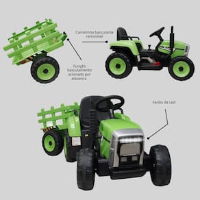 O Trator Elétrico Infantil com Carretinha é uma réplica detalhada de um trator agrícola de verdade, com cores vibrantes, acabamento realista e visual robusto, pensado para transformar cada brincadeira em uma experiência completa ao ar livre.