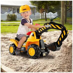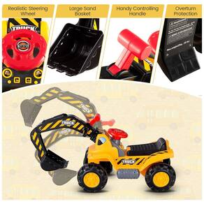 Resistente e durável: o corpo deste passeio infantil bem feito é feito de matéria prima PP e as rodas são feitas de material PE, e é forte o suficiente para suportar uma leve colisão. A superfície impermeável, fácil de limpar e durável irá satisfazer todos os pais. zenamento embaixo: carregue os brinquedos favoritos do seu filho ou guloseimas especiais extras no compartimento de zenamento sob o assento para aquelas longas caminhadas pela vizinhança. Escavadeira frontal: A escavadeira manual controlável pode recolher grandes pilhas de sujeira, areia ou neve, equipada com um forte carregador frontal de múltiplas atividades conjuntas. Buzina: Este passeio infantil apresenta uma buzina e permite que os pequenos finjam que estão dirigindo sua própria escavadeira de construção. É projetado para imitar o visual do escavador de construção adulto, o que ajuda na coordenação das mãos e dos olhos das crianças e desenvolve a destreza e o desenvolvimento das crianças. O braço se estende para brincadeiras realistas e seus filhos vão gostar de simular ser um trabalhador da construção civil.