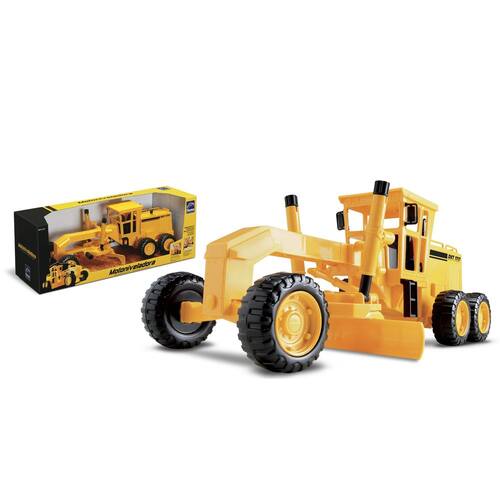 Tamanho do Trator Motoniveladora: 40cm de comprimento, 14cm de largura e 15cm de altura.
