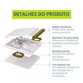 Instalação simples, não é necessário usar ferramentas de perfuração! Basta limpar a área que deseja instalar a trava, retirar o adesivo dupla face e fixar no local desejado, sejam em portas, armários e janelas deslizantes!