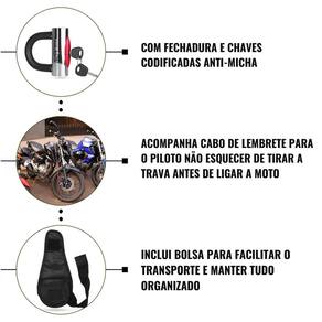 Além disso, o produto acompanha duas chaves e um cabo de lembrete que alerta o piloto para não esquecer de remover a trava antes de ligar a moto, um diferencial prático e funcional que evita transtornos durante a utilização no dia a dia.