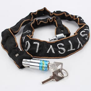 Bicicleta bloqueio de metal anti-roubo ao ar livre motocicleta mountain bikeCorrente bloqueio de segurança reforçada-Especificação: Material principal: aço + poliéster-Comprimento do produto: cerca de 1.00cm-Peso líquido do produto: cerca de 470g### Corrente Dupla ####O Cadeado de Corrente de aço é perfeito garantir a segurança da sua bike quando estacionada em locais públicos. Muito resistente e funcional, conta com duas chaves e excelente tamanho, permitindo seu uso em motos. A corrente conta com revestimento suave que protege a pintura da sua bike. Perfeito para garantir a sua tranquilidade e segurança do seu patrimônio.Cor: PretoMaterial: Aço (sem nenhum material plástico)Chaves: DuasRevestimento: Similar à tecidoConteúdo da embalagem: 01 Cadeado x 02 chavesPeso aproximado do produto: 470 grInformações Adicionais: Produzido em açoInformações Importantes:- Os objetos que ambientam as imagens, não acompanham o produto.- Fique atento: As cores das imagens podem sofrer alterações devido a luminosidade, configurações do monitor e até mesmo a percepção do usuário.Perguntas e respostas