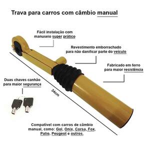 DescriçãoTrava de Segurança Antifurto para Câmbio e Freio de Mão 2 ChavesCompatível Com: Aplicação Universal Exceto Veículos Automáticos Disponível na Cor: Amarela ou Vermelha depende da disponibilidade do estoque OBS: A cor do produto pode variar de acordo com a disponibilidade em estoque.Especificação: Fácil Utilização e Manuseio Fabricado em Metal Resistente Maior Segurança Revestido em Vinil Cabo Emborrachado Excelente Acabamento 2 Chaves Possui Regulagem de DistânciaInstruções de uso: Libere a trava e estenda o gancho na medida necessária. Encaixe o gancho de modo a fixar as duas partes Câmbio e Freio de Mão . Aperte bem a trava Retire a chave Para remover a trava, destranque e recue os ganchos.Conteúdo da Embalagem: 1 Trava de Segurança 2 ChavesImportante: Oferecemos garantia de 90 dias para todos os produtos. Havendo qualquer anormalidade com a peça durante esse período, nos prontificaremos a substituí-la o quanto antes, basta o cliente entrar em contato com nossa central de atendimento. Foto Ilustrativa Não nos responsabilizamos pelo mau uso do produto. Marca: L.E.