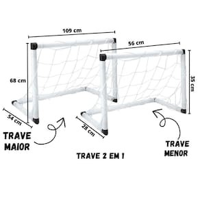 Informações Técnicas: Composição: Plásticos PVC, PE e PP. Duas formas de montar: Medida da trave grande montada: 109cm x 54cm x 68cm. Medida das traves menores montadas: 56cm x 28cm x 35cm. Com acessórios, fácil de montar.