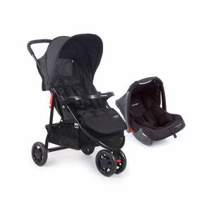 Conjunto de bebê conforto e carrinho de 3 rodas, reclinável tipo berço. Leve e com fechamento fácil. Colchonete macio, barra frontal, amplo cesto e capota.