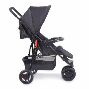 Para os pais, tem manopla com revestimento macio, capota retrátil com visor, amplo cesto porta-objetos com capacidade para 5 kg e bolso na capota. Trava de giro na roda dianteira e freio interligado, de fácil acionamento, nas traseiras.